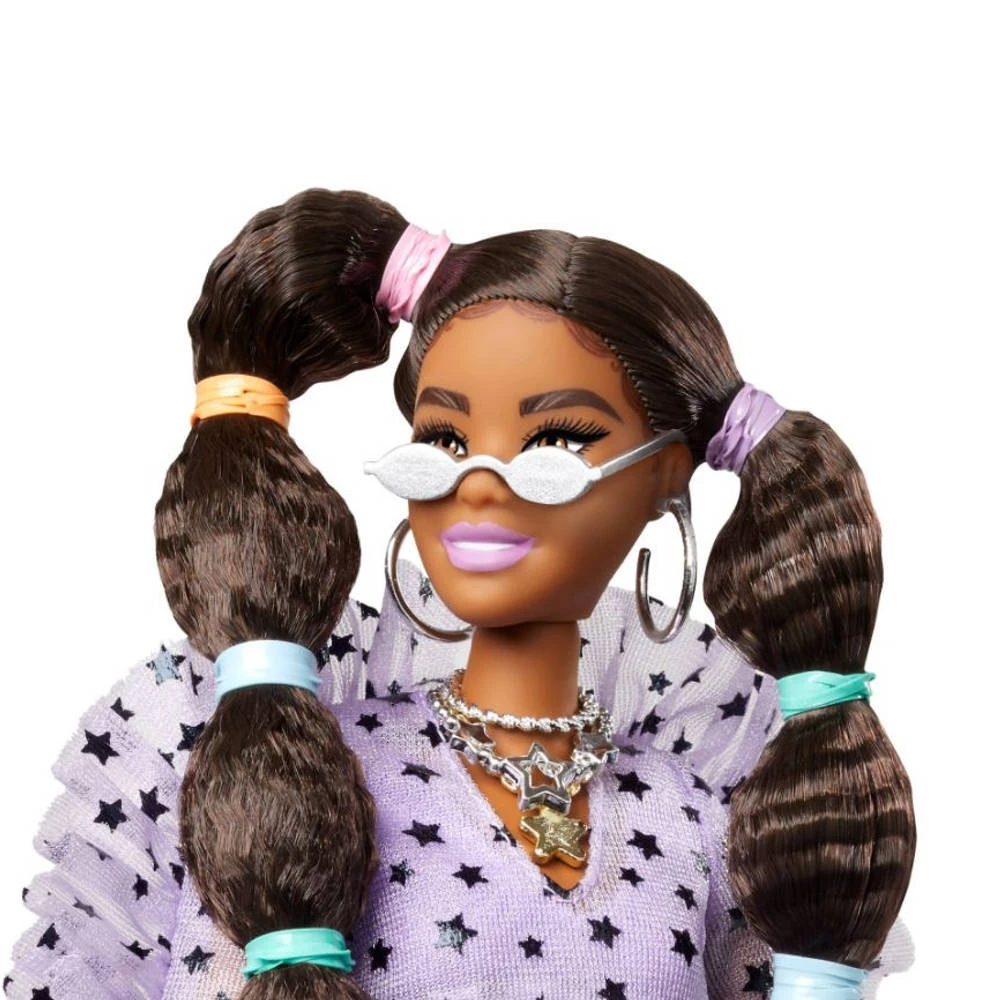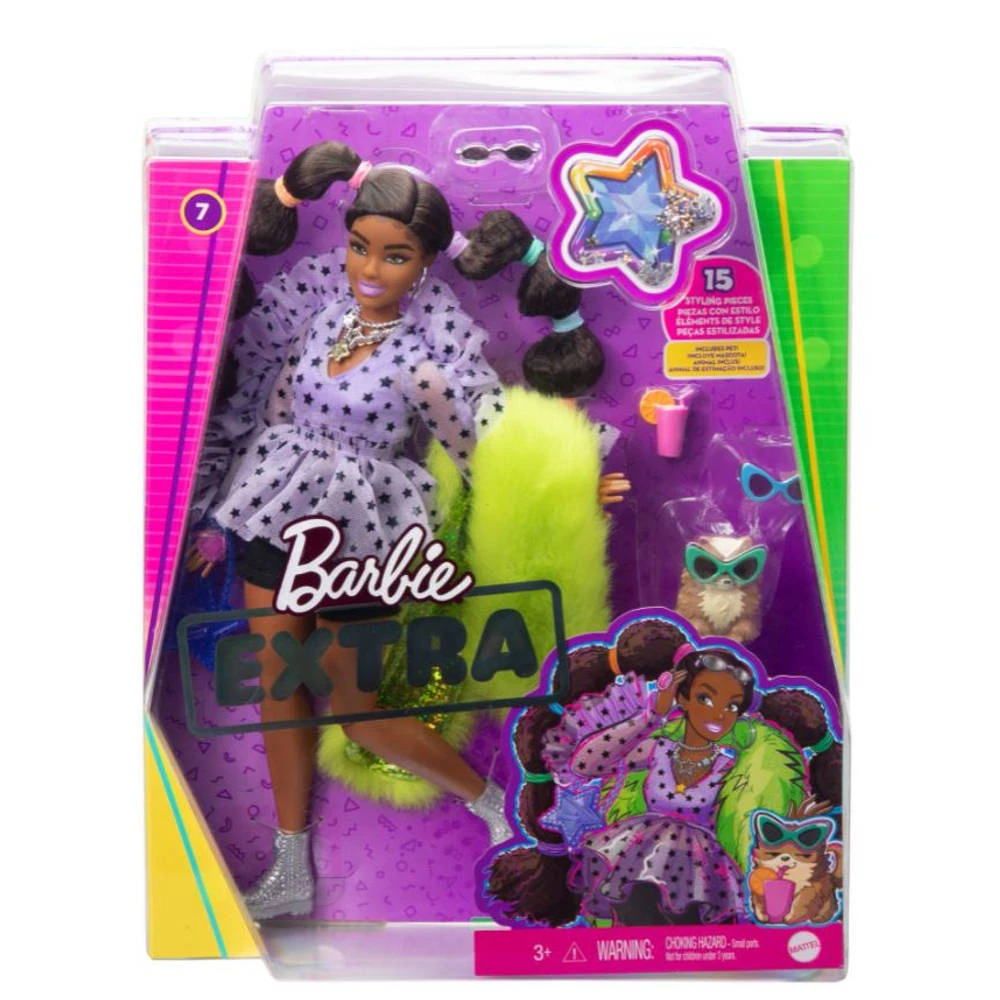 Wat ziet deze Barbie Extra pop met vlechten er supertrendy uit! Ze heeft lange, bruine staarten die gestyled zijn met regenboog rubberen haarbanden. Een leuke en speelse look toont haar zelfverzekerde stijl met een sterprint ruchetop in lavendelpaarse kleur gecombineerd met zwarte shorts met gerafelde rand en een neon faux fur shrug. Deze Barbiepop wordt geleverd met accessoires zoals een stervormige tas, zilveren laarzen, een zonnebril en gelaagde zilveren sieraden. Haar pommeren puppy figuur is ook zo extra, met oversized cat-eyezonnebril en een fruitdrankje. Met Barbie Extra beweegbare poppen kunnen kinderen hun eigen stijl ontdekken en leuke mode- en stylingspelletjes spelen. Alles draait om plezier maken met mode en glitter, gummieberen, emoji’s en opvallende kapsels die overal extra sfeer brengen.