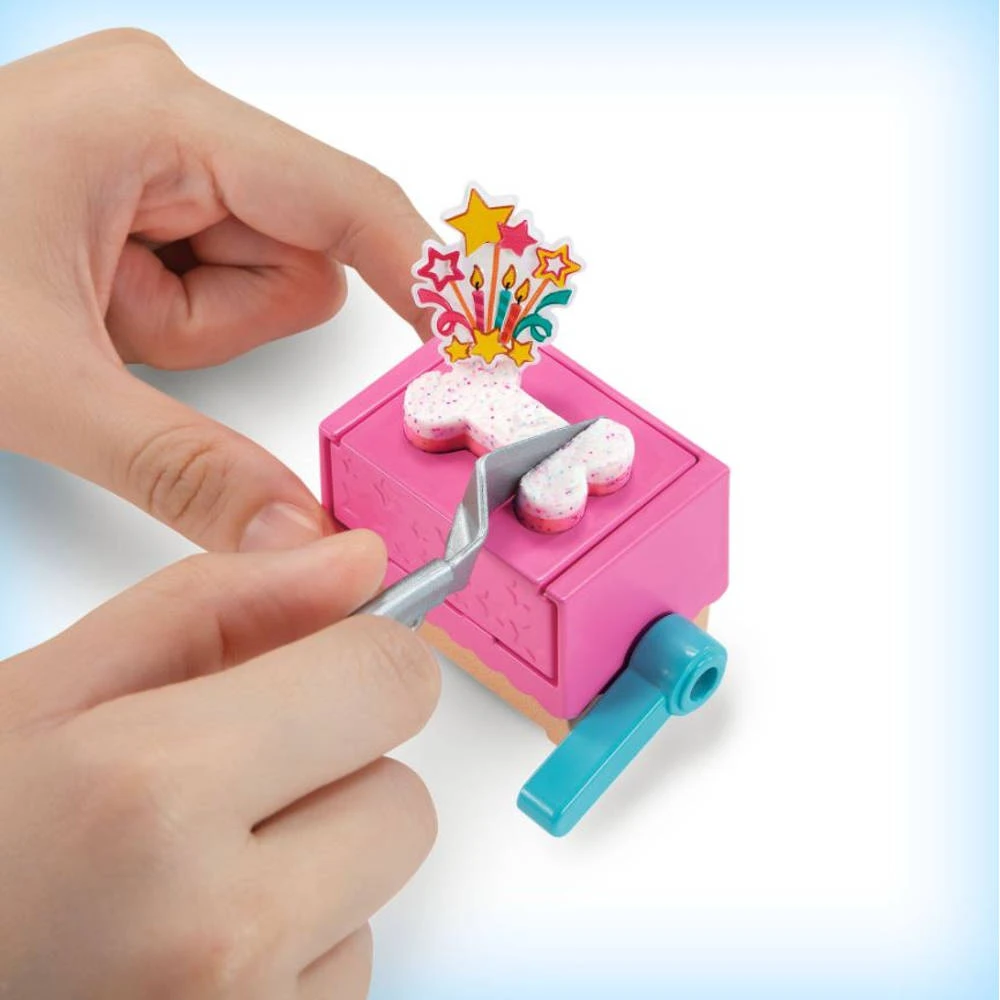 - Vul de taartvorm met twee kleuren klei en duw op de hendel om te zien hoe het ‘deeg rijst’ en hoe er een prachtige taart in de vorm van een bot verschijnt.