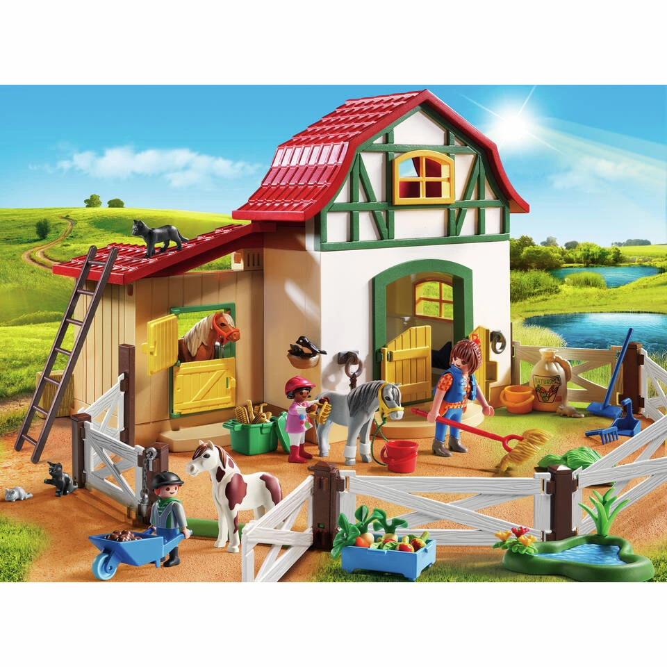Je kind beleeft dankzij het Playmobil Country ponypark veel plezier op de boerderij. Het geeft de pony’s te eten, maar ook een poetsbeurt. PLAYMOBIL-nr. 6927