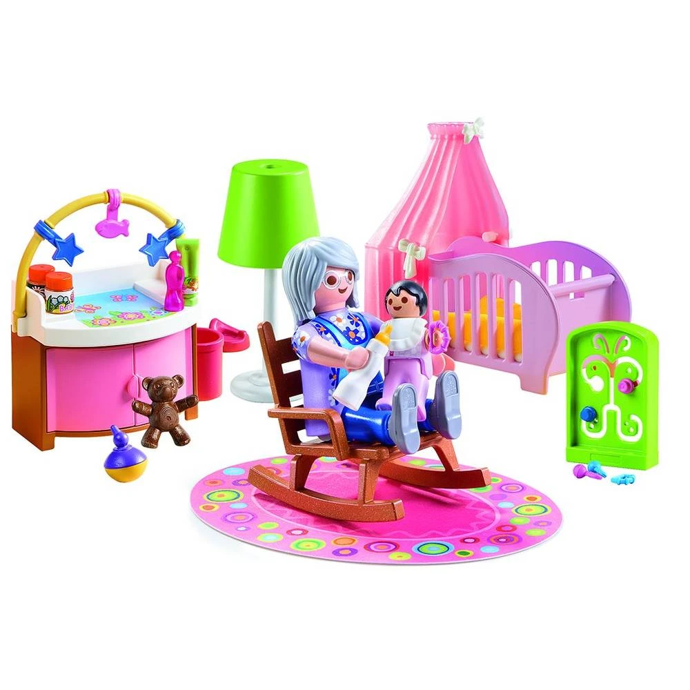 - De speelset bevat twee Playmobil figuren, een commode, een schommelstoel, een babybedje, een staande lamp, speelgoed en vele andere accessoires.