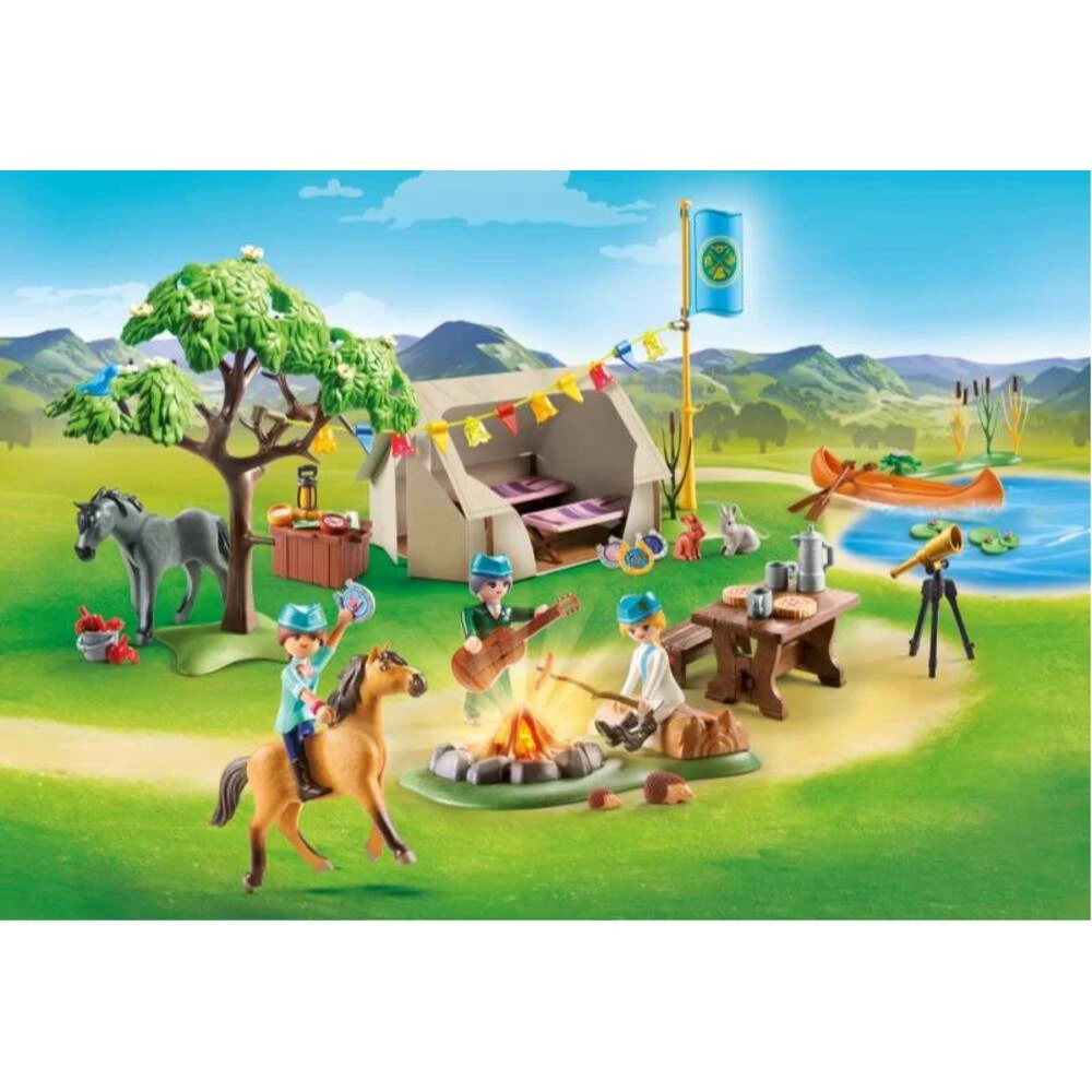 Ben je, net zoals Lucky en Spirit, dol op avonturen? Deze zomer gaan Lucky en haar vriendinnen naar het zomerkamp. Er is hier zoveel te beleven: taart eten, vriendschapsarmbanden vlechten, sterren kijken en natuurlijk trainen met Spirit en haar paarden voor de grote race. Iedereen wil de grote wedstrijd winnen, maar wie bereikt de finish het eerst? ’s Avonds zitten de meisjes rond een gezellig kampvuur met mevrouw Hungerford. Ze grillen worstjes en vertellen elkaar verhalen. Dan gaan ze naar de tent en dromen ze van het winnen van de wedstrijd. Deze leuke zomerkampset van Playmobil bevat Lucky met het paard Spirit, Bebe met het paard Sarge en de kampleider mevrouw Hungerford, een tafeltje met twee bankjes, een telescoop en een opvouwbare kartonnen tent met twee bedden. Het kampvuur heeft een lichtje en kan met een drukknop worden ingeschakeld. Voor de grote fans van Spirit is er een vriendschapsarmband met hoefijzertjes om te verzamelen.