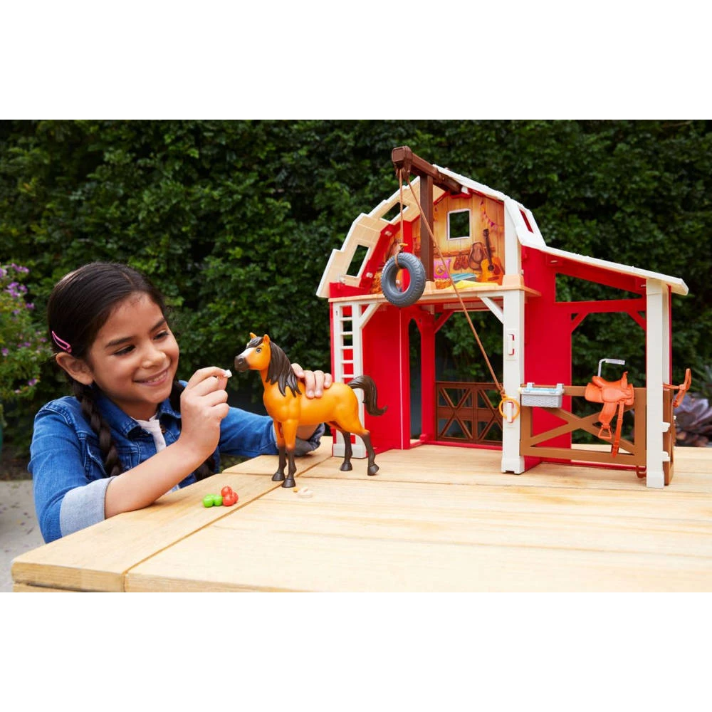 De vriendschap, de moed en het avontuur uit de DreamWorks animatiefilm Spirit Untamed herbeleef je steeds weer met deze gave speelset! De schuurspeelset biedt eindeloos veel speelplezier en kinderen kunnen leren hoe ze paarden moeten voeden, borstelen en verzorgen. De speelset beschikt over een grote schuur met vier speelplekken waaronder een stal, een clubhuis, voedings- en verzorgingsplekken en een bandschommel. De speelset bevat een Spirit paard van ongeveer 20 cm en tien verhalende accessoires: een zadel, een halster, een trog, een mat, een borstel, een verzorgingsborstel, twee wortelsnoepjes en twee appelsnoepjes voor de paarden. Kinderen krijgen een leuke, realistische speelervaring met leuke details zoals een bandschommel die ook als lift fungeert voor een pop om het clubhuis te bereiken, een hek dat open kan, haken om spullen aan te hangen en nog veel meer!