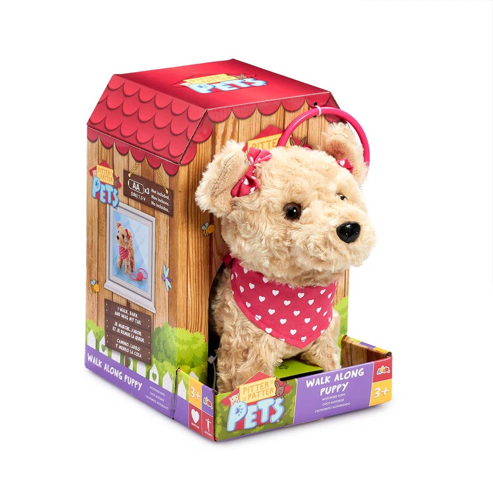 Deze Walk Along puppy houdt van knuffelen, wandelen en spelen! Met haar prachtige gouden haar, roze bandana met stippen en schattige haarelastiekjes moet je haar zeker laten zien aan al je vriendjes! Gebruik de bijgevoegde controller om de pup te laten lopen, kwispelen en blaffen. Bovendien kun je de verpakking direct gebruiken als mooi hok. Leg je huisdier in bed waar het na een dag vol opwinding in slaap kan vallen. Een leuke, harige, Pitter Patter Pets-vriend voor je kleintje!